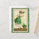 A lovely vintage illustration of a young lady clad in green, with basket of shamrocks, framed with an attractive Irish green plaid pattern. The phrase on the front reads "The Top of the Morning to You."
