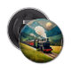 This bottle opener features a vintage steam train against a majestic Mountain View.