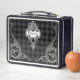 Steampunk style design with ornate Victorian swirl elements with a sophisticated black and grey harlequin patterned background. With an ornate vintage label where you can personalise it, with either a man's or a woman's name. Please remember to change the name on BOTH sides of the Lunchbox.
