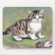 Mouse Pad featuring a striped kitten. Black stripes run across a white kitten’s fur. A white flower decorates a basket in a grassy field. A fantastic gift for cat lovers and Victorian art enthusiasts!