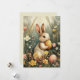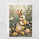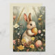 Vintage Style Easter Rabbit Card, A sweet illustrated Easter postcard of a whimsical bunny holding a golden egg, surrounded by blooming spring flowers. DM if you would like this design on other products.
