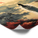 Vintage-style travel poster designed to evoke the allure and beauty of Japan. The central figure is a woman in traditional Japanese attire, standing with her back to the viewer, gazing at a serene landscape. The scene is set during sunset, with the sky painted in warm shades of red and orange that reflect on the calm waters below. She stands on a vantage point, surrounded by vividly coloured foliage, possibly cherry blossoms, which are iconic to Japan. In the distance, mountain silhouettes rise against the backdrop of a large, glowing sun, creating a harmonious blend of shadow and light. Architectural elements such as a red pagoda and torii gates add cultural depth to the scene, and small boats on the water suggest a tranquil way of life connected to nature. The poster captures the essence of Japan as a place of historic beauty and peaceful contemplation.