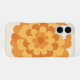 Retro illustration of a stylized marigold flower with rounded, colorful petals in a warm palette.