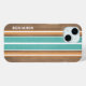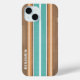 A colourful, retro stripe design in blue and orange on a faux wood print background. A vintage surfboard stripe design with a beach and surf look. Add your name or monogram to make this a personal phone case that will stand out amongst your friends. The name is a thin serif font.