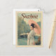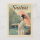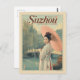Step into the serene beauty of the "Venice of the East" with this exquisite, vintage-style travel postcard celebrating Suzhou, China. This captivating artwork depicts a beautiful woman dressed in traditional Chinese silk attire, holding a delicate pink paper umbrella, standing by a tranquil classical garden waterway. The scene features the iconic willow trees, arched bridge, and soft, ethereal lighting that defines Suzhou's famous landscape. This design beautifully evokes the city's rich history as a center for scholars, silk, and sublime gardens.