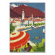 Vintage artwork of a classic lake side scene at Lago Maggiore in Tessin, Switzerland with a figure sat under a large red and white sun umbrella in the foreground.