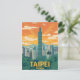 A vibrant vintage-style travel poster celebrating the dynamic city of Taipei, Taiwan. The illustration features the iconic Taipei 101 skyscraper rising above a lush, green foreground of tropical foliage. The city skyline is bathed in the warm glow of a setting or rising sun, with a plane soaring overhead. This retro design is perfect for those who love travel, modern cityscapes, and the unique blend of nature and urban life found in Taiwan. It's an ideal piece of art to add a touch of adventure and culture to any space.