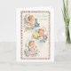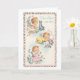 A vintage greeting card image features three scenes from a baby's day. In one, the baby plays with a toy giraffe, in another the baby takes a nap while sleeping in the buff, and in the third, the baby shakes a rattle. The front of the card says "To You and Your New Baby." The message inside the card is "Wishing you a future filled with love, happiness, and laughter with your new baby."