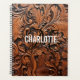 Rustic brown planner with a tooled faux leather background and a script monogram and a typography name. Personalise name and initial.