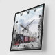 A square clock with a photograph of a snowy winter landscape with snow-covered pine trees. A red, gold and black old-fashioned train travelling through the wilderness. Conjures up thoughts of coming home for Christmas.