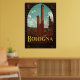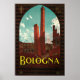 This travel poster is for Balogna, Italy, It shows a cityscape as seen through an arched window.