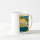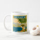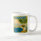 Vintage travel poster for Jamaica, the gem of the tropics, showinga woman standing before a body of water carrying a fruit basket on her head. In the background, mountains and a village. circa 1910.