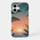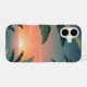 Retro illustration of a tropical sunset featuring stylized banana leaves and a warm light.