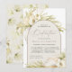 Tropical chic baby dedication invitations in an alluring neutral colour palette feature a central arched element bearing your church ceremony and celebration or party details, accented with pale green watercolor palm fronds, beachy island foliage, white orchids, boho dried botanicals and pampas grass.