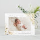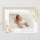 Elegant floral birth announcement in chic island pastel colours features a single full bleed horizontal or landscape orientated photo with clusters of watercolor orchid flowers, dried palm fronds, leaves, and pampas grass at the corners. Personalise with baby's name, birth stats, and a personal message, and add three additional square photos to the back.