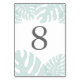 Island chic table number cards in shades of pastel seafoam green and elegant medium grey feature your table number framed by lush tropical monstera leaves. Design repeats on reverse side. Coordinates with our Vintage Tropics wedding invitation suite for beachside affairs or destination weddings.