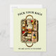 This vacation trip announcement template features an antique illustration of a trunk and its contents. You can easily personalise the text and customise the background colour in this template.