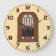 Bring classic style to your wall with this unique clock featuring the vintage tube radio cabinet graphic. The beautiful antique wooden console illustration creates a focal point with a retro style furniture decorative aesthetic. This functional timepiece is perfect for the kitchen, office, or living room, offering a nod to old-fashioned communication technology and nostalgic illustration art. A perfect gift for collectors and home decorators. Search terms: Vintage radio cabinet wall clock, Retro style music room timepiece, Classic wooden console clock, Antique electronic device home decor.