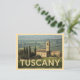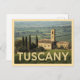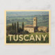 A beautiful vintage-style postcard capturing the quintessential Tuscany landscape. The image features a classic stone church with a bell tower and iconic Italian cypress trees, set against the backdrop of the region's famous rolling green hills. The muted, classic colours and retro filter give this card an authentic vintage travel poster feel, evoking the romance of the Italian countryside. This card is perfect for sending a thoughtful message, commemorating a trip to Italy, or framing as a small piece of European art. A great design for anyone who loves wine country, rustic charm, or the beauty of the Mediterranean.
