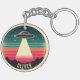 This eye-catching personalised keychain features a vintage cartoon design with a touch of grunge. The scene depicts a UFO soaring through a stunning twilight sky. The upper part of the sky is a deep, mysterious blue, dotted with twinkling stars. As your eyes travel down, the sky transitions into a fiery red, casting a warm glow on the silhouetted landscape below. The highlight of the design is the UFO, its bright light illuminating the land beneath it in a vintage style. This unique round design can be personalised, making it the perfect gift or a special addition to your own keychain collection.