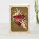 This greeting card shows a vintage-style picture with an aged gold background and a raised-looking frame around the edges. In the middle there’s a deep red heart filled with pink roses and small blue forget-me-nots. Above the heart, a chubby little cupid with rosy cheeks and pale pastel wings aims a tiny bow, and the golden arrow is already going through the heart with a bit of gold sparkle around it 💘. Below, another cupid with curly blond hair and a sweet, focused face reaches up toward the heart as if helping hold it in place. The colors stay soft and warm, with reds, pinks, greens, and light blue standing out against the worn gold backdrop. There isn’t any printed message visible on the front in this image, so the artwork does all the talking ❤️. It’s a sweet way to share Valentine’s Day feelings with someone you care about 😘.