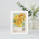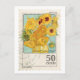 This postcard features an illustration of the Van Gogh painting Sunflowers on a vintage stamp.
