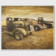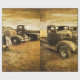 Three classic vehicles sit in a field for sale. Old texture laid on photograph creates vintage feel of old trucks and cars.