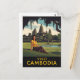 This vintage-style travel poster beautifully captures the timeless beauty of Angkor Wat, a UNESCO World Heritage site in Cambodia. The design features a woman resting in a grassy area with the magnificent temple complex and a reflecting pool in the background. The art style, with its bold lines and rich colours, evokes the golden age of travel advertising. The simple text, "Visit Cambodia," adds a classic, retro feel.