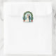 Includes 20 small stickers on one sheet. Elegant cartoon illustration of a bride and groom under a floral arch with a city skyline backdrop, perfect for wedding celebrations.