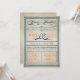 This 5" x 7" wedding invitation has a vintage, old fashioned feel with old-timey letter design, including elaborate script elements, a decorative banner, l stars and a swirly ampersand. The text reads: "You're Invited to the wedding of [customisable name] & [customisable name] [customisable date] [customisable time]. Please Join Us for an Unforgettable Celebration". Further personalise the invitation with the wedding ceremony and reception information and address, each in their own box with dotted border.