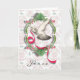 A white dove carries a red ribbon against the backdrop of a green French vintage emblem design. The background is a pink, green, and white damask wallpaper. This is a very feminine card perfect for a refined lady.