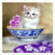 Photo Print featuring a fluffy white kitten! The blue eyed kitten sits in a blue bowl with pink flowers. A purple flowered blanket is draped in front. A marvellous gift for cat lovers and Victorian art enthusiasts!