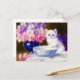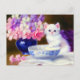 Postcard featuring a beautiful white kitten wearing a purple ribbon! This fluffy kitty poses next to a blue bowl and a vase of pink, purple, and white flowers. A marvellous gift for cat lovers and Victorian art enthusiasts!