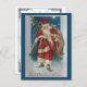 Nostalgic restored Victorian-era Christmas illustration featuring red-robed Santa Claus carrying a bag of presents and tree in the snow with a dark blue winter sky and single glowing gold star. Border colour is editable. "Best Christmas Wishes" in red typography. Back features complementary filigree antique border graphic with editable text fields for your greeting and personalisation.