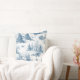 A timeless seamless pattern throw pillow inspired by traditional Toile de Jouy artistry, featuring intricate vintage winter scenes in blue on a soft cream background. The design depicts snow-covered cottages, pine trees, and people enjoying a sleigh ride pulled by reindeer, capturing the nostalgic charm of an old-fashioned Christmas.