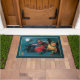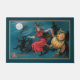 Whimsical restored vintage Halloween greeting card illustration featuring smiling witch in red dress hand-in-hand dancing with black cat and funny pumpkin person under a full moon with "Hallowe'en" text. Background colour is editable.