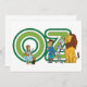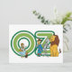 Large letters that spell the word "OZ" surrounded by characters from the Wizard of Oz, the young girl Dorothy, her pet dog Toto, the Cowardly Lion, the Tin Woodsman and the Scarecrow.