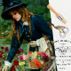 Vintage figurative illustration The Flower Girl by Herbert Gustave Schmalz portrays a woman with long red hair wearing a teal blue coat and hat, wearing gloves with a scarf draped over her arm holding a basket full of flowers.