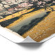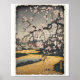 This poster presents a captivating woodblock-inspired scene of delicate cherry blossoms in bloom, with soft pink petals drifting down onto a tranquil river. The vintage colour palette of warm yellows and muted greens enhances the traditional Japanese landscape, featuring a distant temple and gently curving banks. The intricate details and textured edges evoke a timeless aesthetic, making this artwork a perfect representation of nature's fleeting beauty in traditional Japanese art. Ideal for lovers of vintage prints and classic botanical scenes.