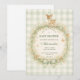 A soft woodland baby shower design featuring a delicate watercolor fawn standing above a floral forest wreath. Gentle greenery, tiny mushrooms, and wildflowers surround the center, while a soft sage gingham background and ribbon bow add a cozy countryside nursery feel. The vintage storybook illustration style and muted woodland palette create an elegant and whimsical design perfect for a nature-inspired celebration welcoming a new baby.