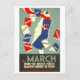 This postcard is a reproduction of a vintage WPA library poster reading, "In March, read the books you've always meant to read." It shows a woman on a windy day surrounded by books by Austen, Scott, Tolstoy, Twain, Dickens, and so on.