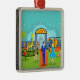 This Vintage Zoo Christmas Ornament shows a 1950's, classic television style family on a weekend excursion. This mid century modern, minimalist art design features a cartoon drawing of a perfect day at the zoo. Yes, it's a beautiful day for a family outing and you've come to the right place. Step through the wrought iron gate, beneath the yellow sign with red lettering that says, "ZOO." Once inside, you'll see an orange, stone pathway flanked by lush, green grass. In a large cage, you'll notice the majestic lion. This orange and yellow king of the jungle is keeping his eyes on an adorable, blonde girl in a pink dress, who, coincidentally, is keeping her eyes on him. On the opposite side of the walkway, you can't miss the towering, yellow and brown giraffe in a round enclosure. He is at eye level with the swaying palm tree in the background. A young, boyish scamp wearing a bright, red shirt and blue jeans is in a hurry to get somewhere. Oh, my! It looks like he's making a beeline to a zookeeper. The keeper of the zoo is dressed appropriately in khaki shorts, shirt, and hat. What's that he's holding? A monkey! And what's that the money is holding? A banana! Folks, it does not better than this! Standing on the walkway, we see Dad. Whew! I'm glad to see he knows it pays to look your best, even on a day off from the office. He is wearing a blue suit, light blue shirt and red tie. Dad is handing off three balloons, in shades of orange, blue and red to Mum. Mum is wearing a blue dress with a form fitting bodice and flared skirt. Her flippy, blonde hairstyle is most becoming. The sky is shades of aqua, teal and blue and is filled with magical, white stars. Just like the zoo itself, this design is fun for the whole family and is perfect for children of all ages.