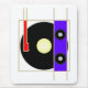 A stylised vinyl disk is the centre of a graphic composition, flanked by speakers in a blue hue and a tint in red hue. The design is encapsulated on a white border and set against a neutral white background, projecting a modern, minimalist atmosphere.