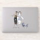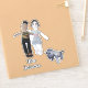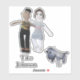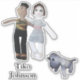 Couple and dog toys with Name to personalise. Male doll is wearing tank-top, long black pants and shoes. Female is wearing grey top and skirt with red waistband. Dog is striped greys and white, with pink tongue lolling out.