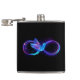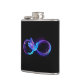 Glowing, purple infinity symbol with flying, luminous, blue hummingbird on black background. Neon.