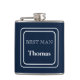 Vinyl wrapped flask is shown in a solid colour of navy blue with a sample best man name.