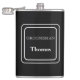 Vinyl wrapped flask is shown in a solid colour of black with a sample groomsman name.