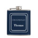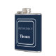 Vinyl wrapped flask is shown in a solid colour of navy blue with a sample groomsman name.
