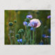 View of one violet poppy flower and poppy seed boxes on background of green meadow. Poppy is herbaceous plant with showy flowers, milky sap, and rounded seed capsules.