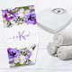 Two elegant borders of violet, lavender coloured, purple and white flowers, pansies on an elegant white background. Personalise and add your name and monogram letter, initial. Purple coloured letters. The name is written with a modern hand lettered style script with swashes. To keep the swashes only delete the sample name, leave the spaces or emoji's in front and after the name.